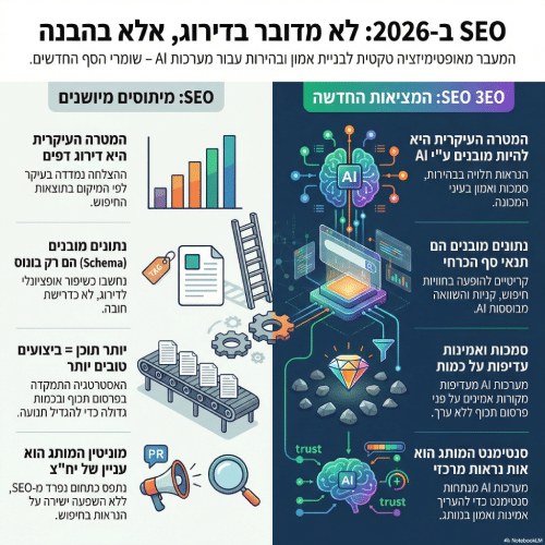 | SEO עוסק בעיקר בדירוג דפים | דירוגים עדיין חשובים, אבל הם משמשים כאותות לסמכות ורלוונטיות, ולא כמדד הסופי של נראות |